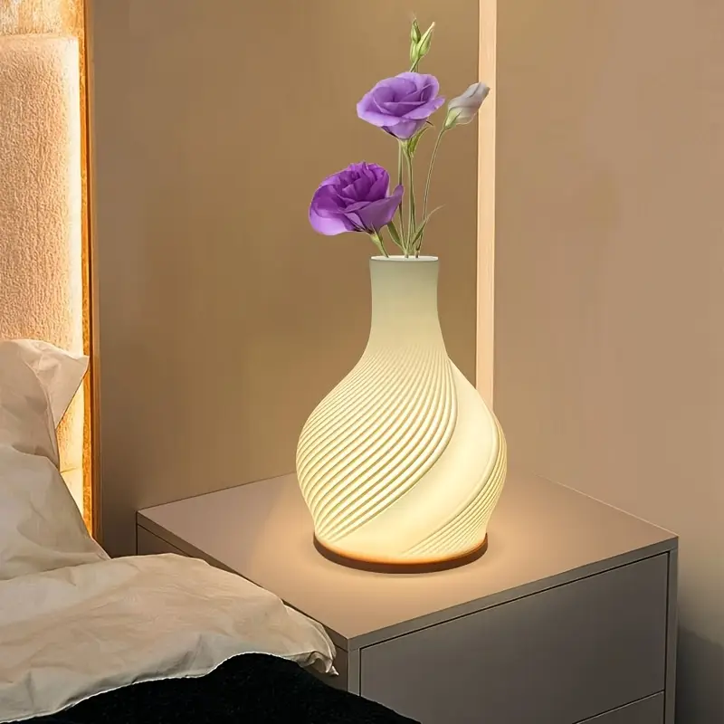 Esta lámpara florero (conocida como Floral Lights) es un objeto decorativo multifuncional que combina iluminación LED con un jarrón para flores. Su diseño se caracteriza por una estructura con líneas en espiral, comúnmente fabricada mediante tecnología de impresión 3Dutilizando materiales como resina o bioplástico (PLA).